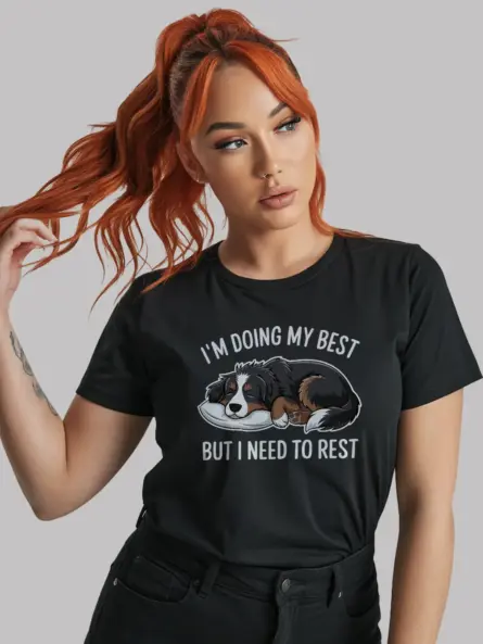 Show your love for Bernese Mountain Dog shirt with this playful and cute “Bernese Mountain Dog shirt” . Featuring an adorable cartoon of a Bernese Mountain Dog peacefully napping on a pillow, this shirt brings comfort and fun to any dog lover’s wardrobe. The text “I’M DOING MY BEST” and “BUT I NEED TO REST” adds a humorous touch, perfect for those who understand the value of relaxation. Whether you’re a dog mom, dog dad, or just a fan of this lovable breed, this shirt is for you.