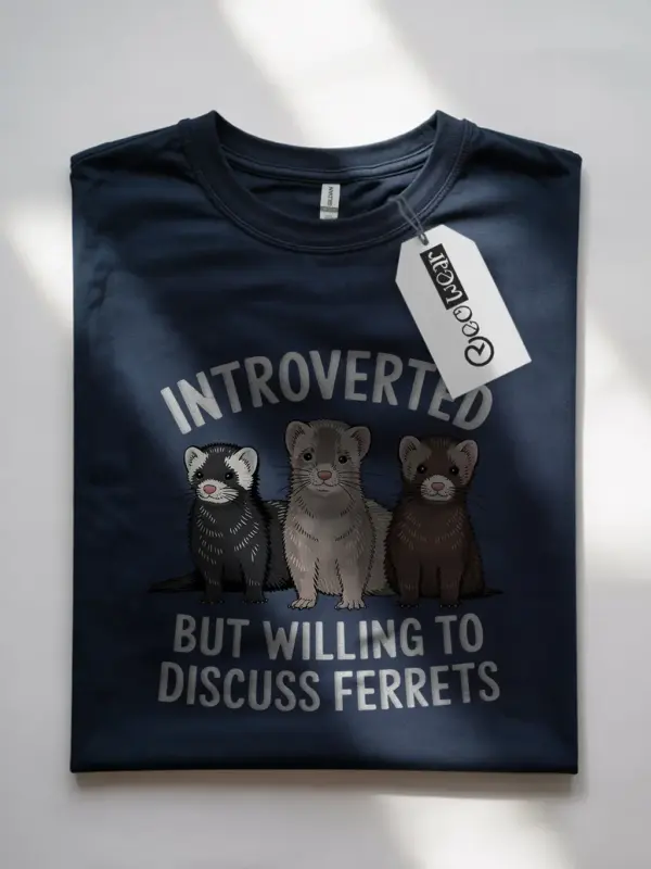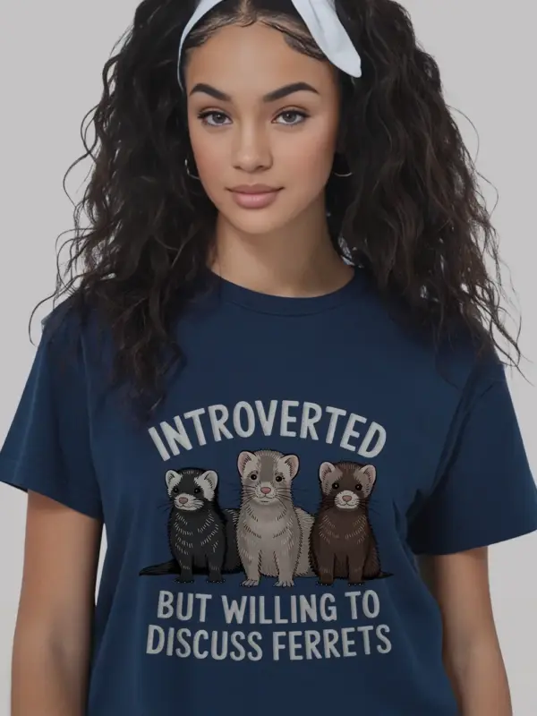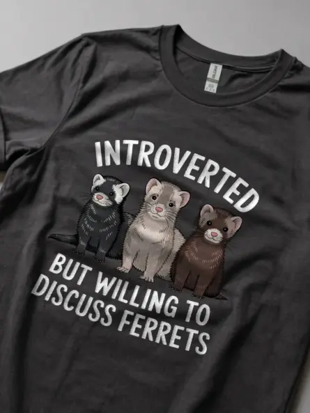 This fun design showcases three adorable ferrets in various colors and patterns. The left ferret is black with white markings, the middle one features a brown coat with black and white splotches, and the right ferret has a dark brown coat with lighter highlights. Above them, bold white text reads “INTROVERTED,” while below, the phrase “BUT WILLING TO DISCUSS FERRETS” is written in a decorative font that adds a playful touch. The dark background makes the bright colors of the ferrets and text pop, making this tee a real conversation starter.