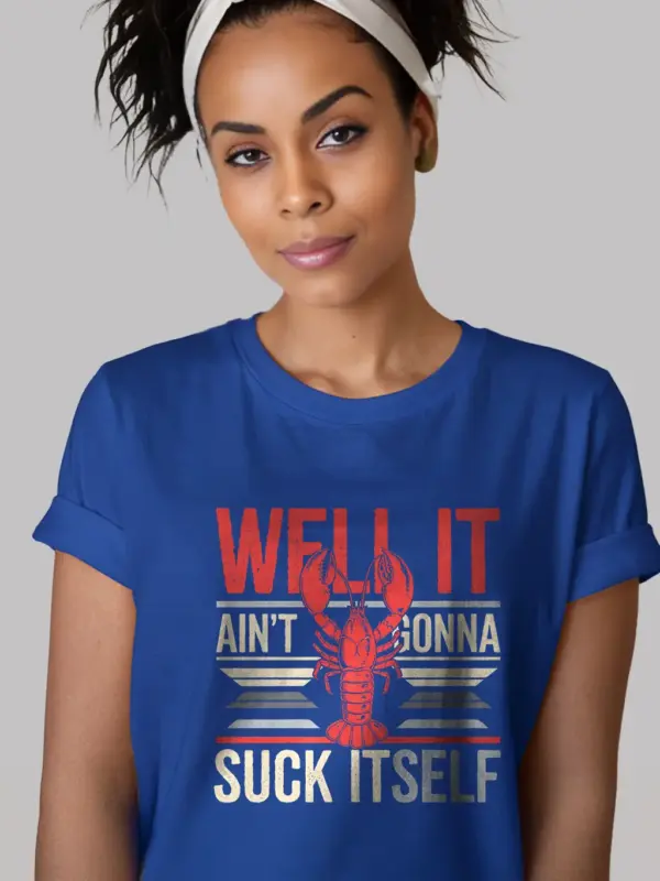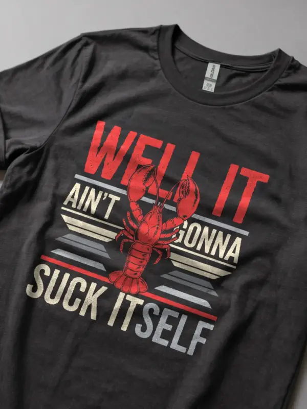 Get ready to turn heads and crack smiles with the Funny Lobster T-shirt—a cheeky and bold design made for seafood fans and lovers of good humor. This hilarious tee features a bright red lobster centered on a dark background. Above it, “WELL IT” is displayed in large white letters, with “AIN’T GONNA” just below in a smaller font. The punchline, “SUCK ITSELF,” appears under the lobster in playful white and gray text, making this shirt impossible to ignore.