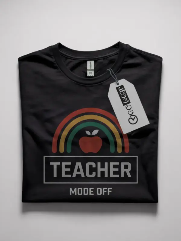 The design features a vibrant rainbow arching above a classic red apple—a symbol every teacher knows well. Beneath the rainbow, the bold white text “TEACHER” sits confidently in a rectangular box, while the phrase “mode off” rests below in a clean, subtle font. Set against a deep black background, the design pops with cheerful colors and bold personality.